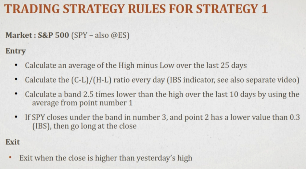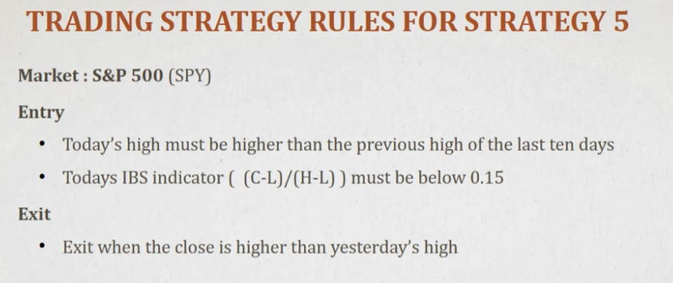 You also need the IBS indicator: IBS is (Close - Low) / (High - Low). It tells you where the close is relative to the day’s range. If SPY closes under that band you calculated and the IBS is lower than 0.3, you go long at the close.