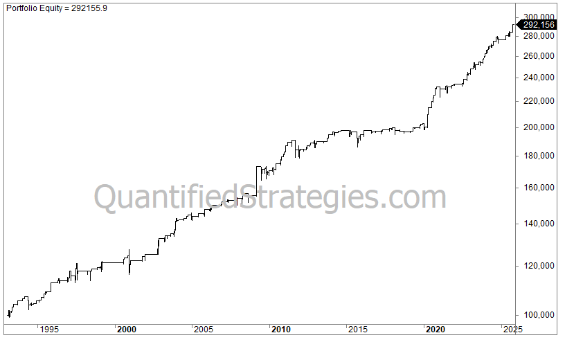 It doesn’t work every single time because losing trades are part of the process, but the equity curve since 1993 shows it’s a consistent way to grab small gains.