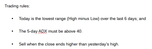 For this strategy, you want the 5-day ADX to be above 40. That means there is a very strong trend happening. At the same time, you want today’s range, the High minus the Low, to be the lowest range of the last 6 days. This is a “volatility squeeze.”