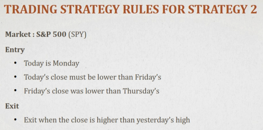 The reason these strategies matter is that they give you a mathematical edge. You aren’t guessing. You are looking for specific conditions, like a Monday close being lower than a Friday close, and acting on them.