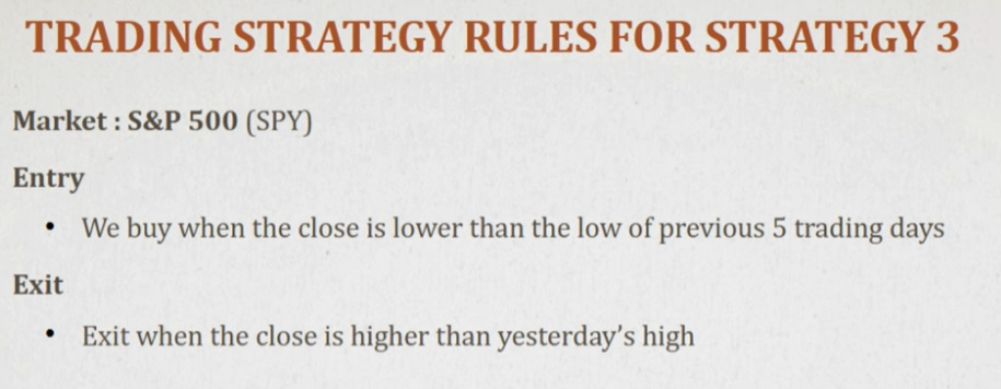 You buy when the close is lower than the low of the previous five trading days. That’s it for the entry. You are looking for a week’s worth of downward pressure. When the market breaks below a five-day low, it’s often overextended to the downside.