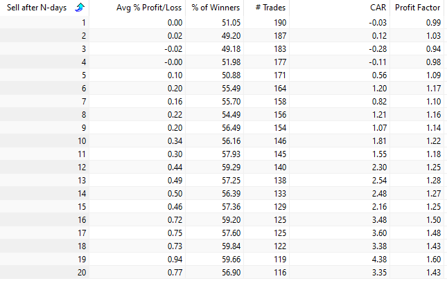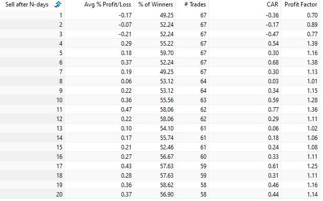 It performs consistently across several holding periods and also appears often enough to generate multiple trades per year.