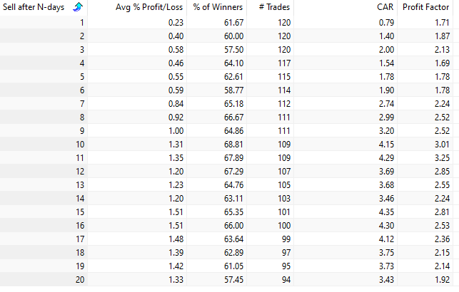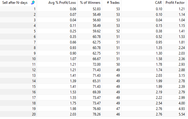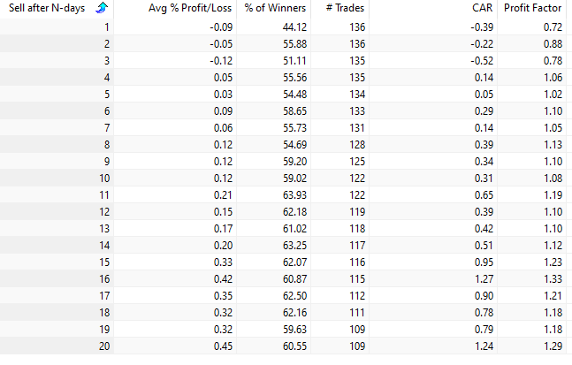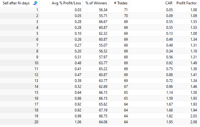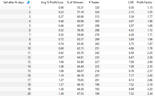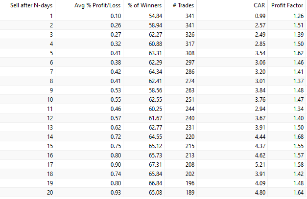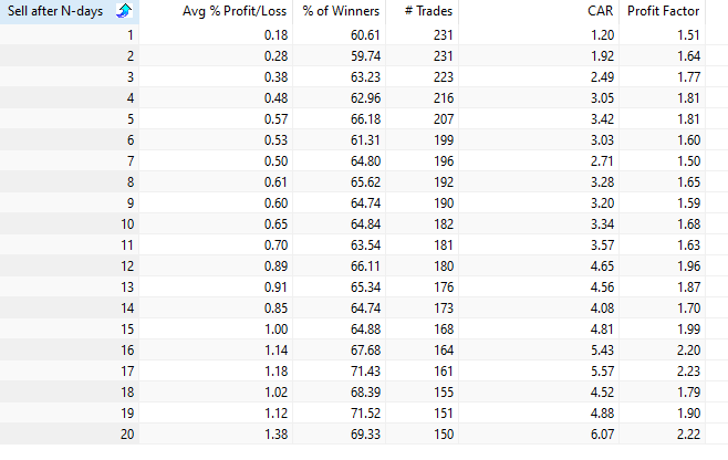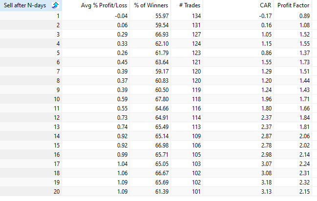 Instead of exiting after a fixed number of days, the strategy exits when the closing price moves above the previous day’s high.