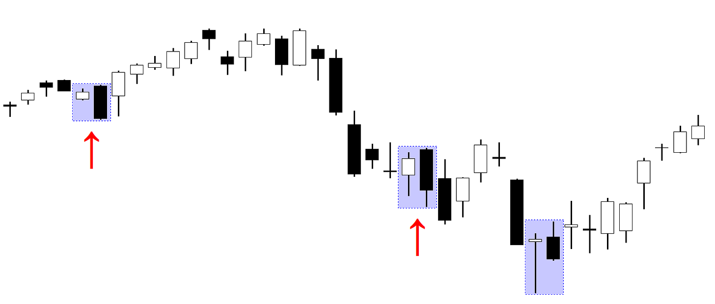 A bullish candle followed by a larger bearish candle that fully engulfs the previous candle’s body.