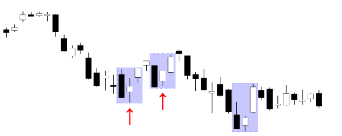 The first two candles form an inside pattern, followed by a bullish breakout.