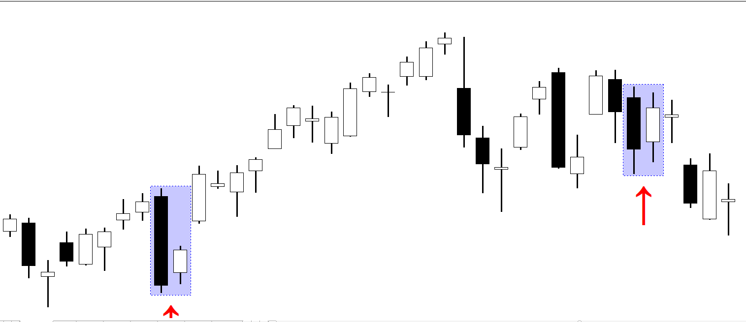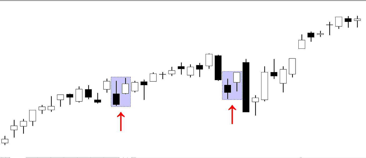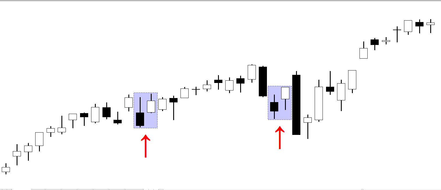 The first candle is bearish and relatively large. The second candle is small and bullish, and its entire body sits inside the previous candle’s body.