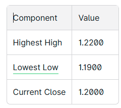 This raw value falls in neutral territory. If the close rose to 1.2150, %R would calculate to -16.67 (considered overbought). A drop to 1.1950 yields -83.33 (considered oversold).
