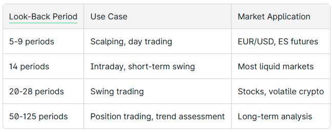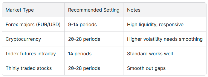 Longer settings (20, 28, 50, 125 periods): Smooth out price action, reducing whipsaws at the cost of delayed entries. Appropriate for swing trading and position trading.