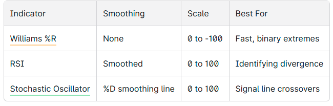 The williams r works better for traders wanting raw, unfiltered momentum readings. RSI and Stochastic suit those preferring smoothed signals.